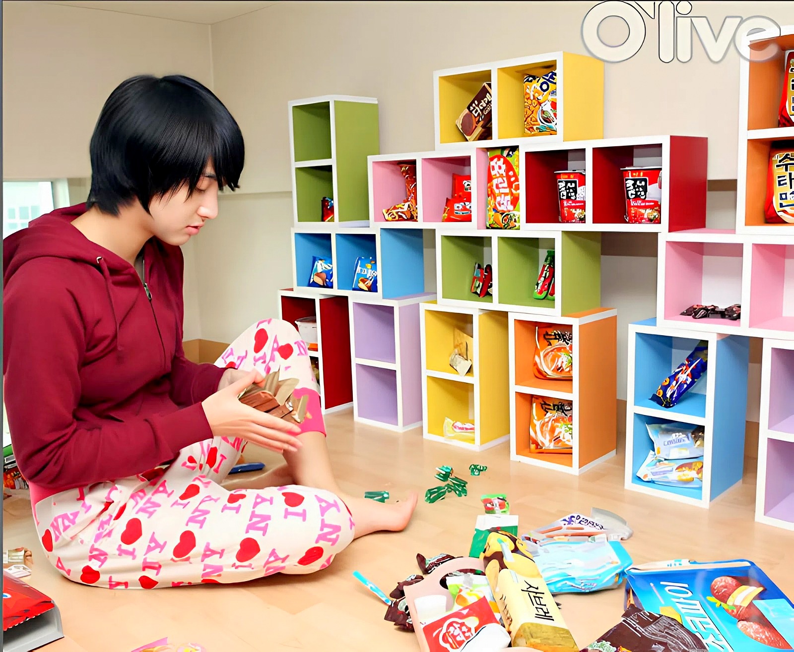 이해인 (갱키즈) 올리브 악녀일기 시즌4 7회 촬영현장에 인스턴트 라면과 과자 컬렉션 옆에 앉아 있다.